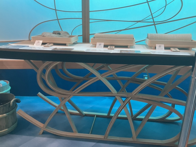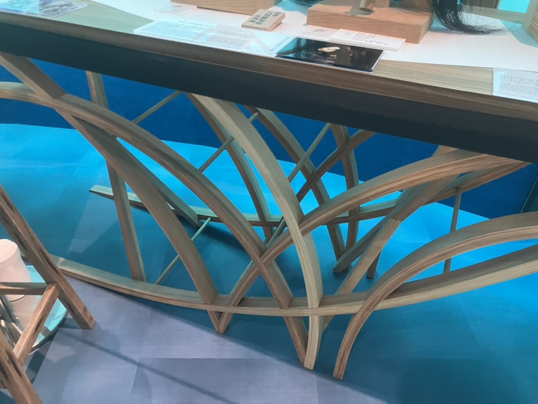 さらに、圧密加工を施した木材による曲げ加工のテーブル脚を製作し、唯一無二の造形表現を実現いたしました。