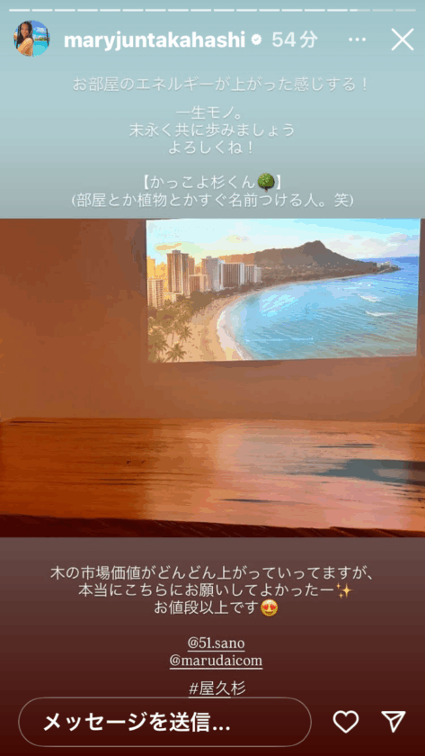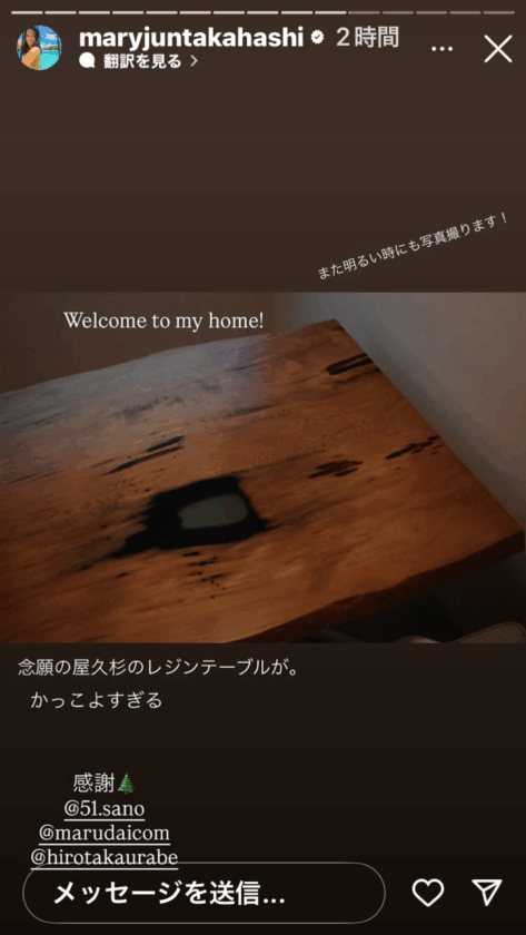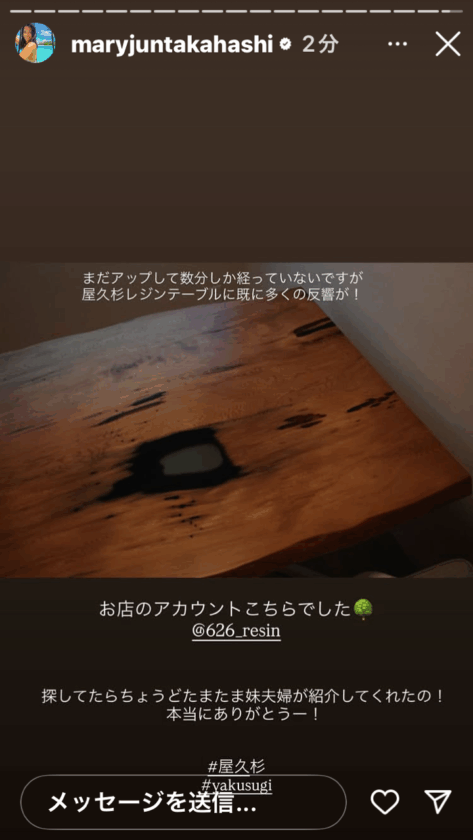 このたび、女優・モデルとしてご活躍の高橋メアリージュン様に、一点物の屋久杉レジンテーブルをお迎えいただきました。